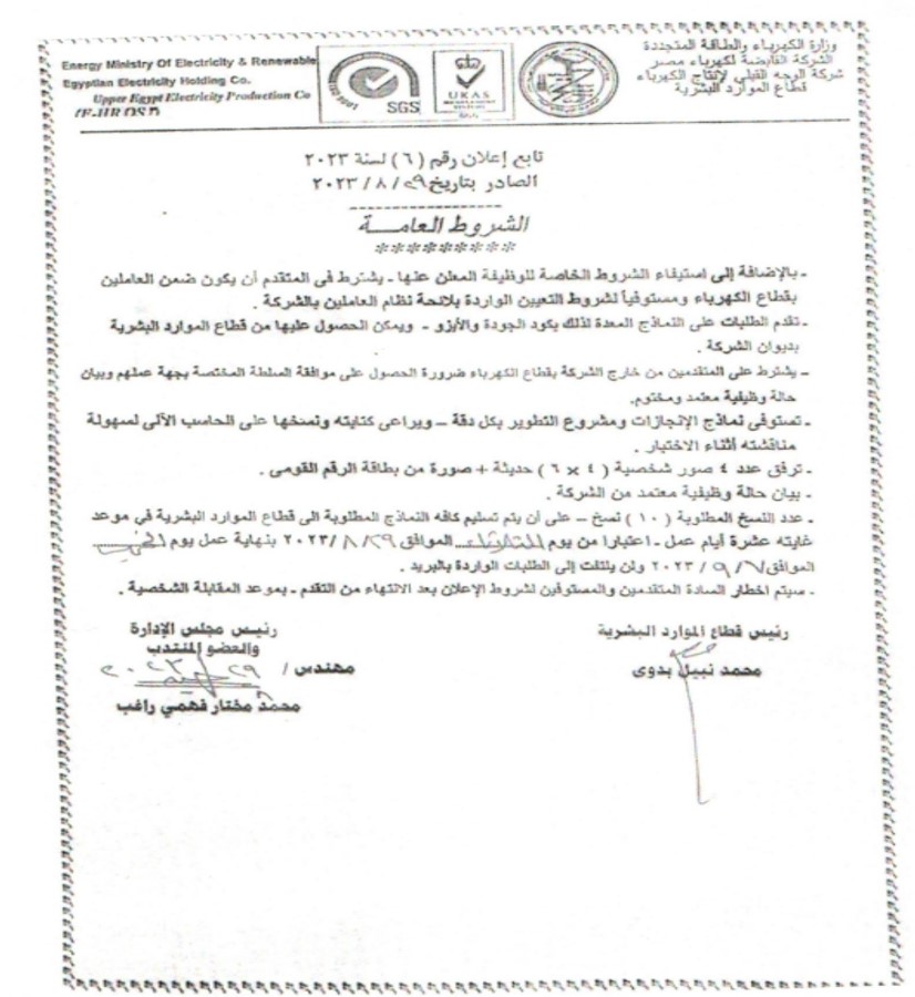 تعلن شركة الوجه القبلي لانتاج الكهرباء عن حاجتها للوظائف التالية وفقا للإعلان رقم (6) لسنة 2023 الصادر بتاريخ 2023/8/29 لشغل وظيفة :