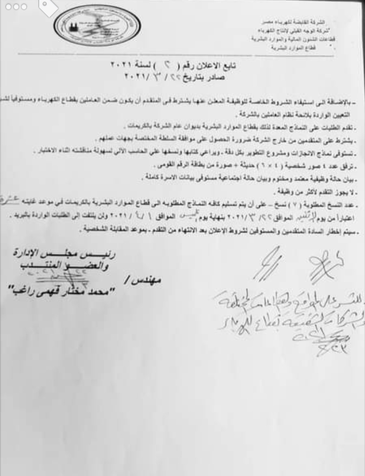 تعلن شركة الوجه القبلي لانتاج الكهرباء عن حاجتها للوظائف التالية وفقا للإعلان رقم (2) لسنة 2021 الصادر بتاريخ 2021/3/22:-