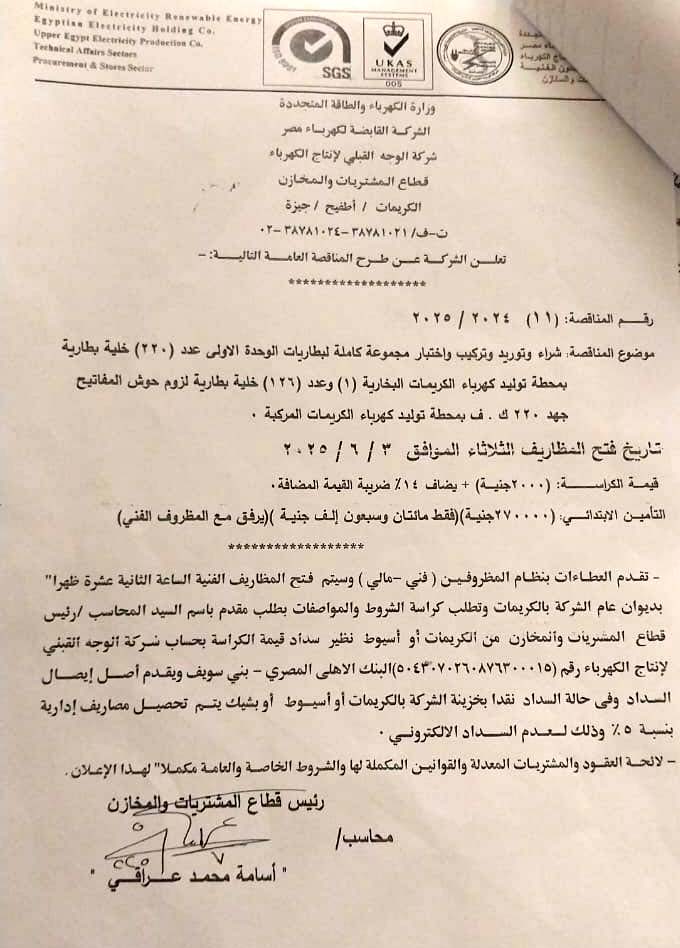 | التفاصيل | قيمة كراسة الشروط (٢٠٠٠ جنيه) + يضاف ١٤% ضريبة القيمة المضافة. التأمين الابتدائى: (100000 جنيه) (فقط مائة الف جنيه)(يرفق مع المظروف الفنى) ------------------- تقدم العطاءات بنظام المظروفين (فنى - مالى) وسيتم فتح المظاريف الفنية الساعة الثانية عشر ظهراً بديوان عام الشركة بالكريمات وتطلب كراسة الشروط والمواصفات بطلب مقدم باسم السيد المحاسب/ رئيس قطاع المشتريات والمخازن من الكريمات أو اسيوط نظير سداد قيمة الكراسة بحساب شركة الوجه القبلى لانتاج الكهرباء رقم (5043070260876300015) البنك الاهلى المصرى - بنى سويف ويقدم اصل ايصال السداد وفى حالة السداد نقداً بخزينة الشركة بالكريمات أو اسيوط او بشيك يتم تحصيل مصاريف ادارية بنسبة 5% وذلك لعدم السداد الاليكترونى. - لائحة العقود والمشتريات المعدلة والقوانين المكملة لها والشروط الخاصة والعامة مكملا لهذا الاعلان. |