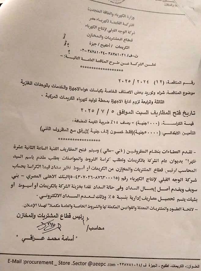 | التفاصيل | قيمة كراسة الشروط (٢٠٠٠ جنيه) + يضاف ١٤% ضريبة القيمة المضافة. التأمين الابتدائى: (١٥٠٠٠٠ جنيه) (فقط مائة خمسون الف جنيه)(يرفق مع المظروف الفنى) ------------------- تقدم العطاءات بنظام المظروفين (فنى - مالى) وسيتم فتح المظاريف الفنية الساعة الثانية عشر ظهراً بديوان عام الشركة بالكريمات وتطلب كراسة الشروط والمواصفات بطلب مقدم باسم السيد المحاسب/ رئيس قطاع المشتريات والمخازن من الكريمات أو اسيوط نظير سداد قيمة الكراسة بحساب شركة الوجه القبلى لانتاج الكهرباء رقم (5043070260876300015) البنك الاهلى المصرى - بنى سويف ويقدم اصل ايصال السداد وفى حالة السداد نقداً بخزينة الشركة بالكريمات أو اسيوط او بشيك يتم تحصيل مصاريف ادارية بنسبة 5% وذلك لعدم السداد الاليكترونى. - لائحة العقود والمشتريات المعدلة والقوانين المكملة لها والشروط الخاصة والعامة مكملا لهذا الاعلان. |