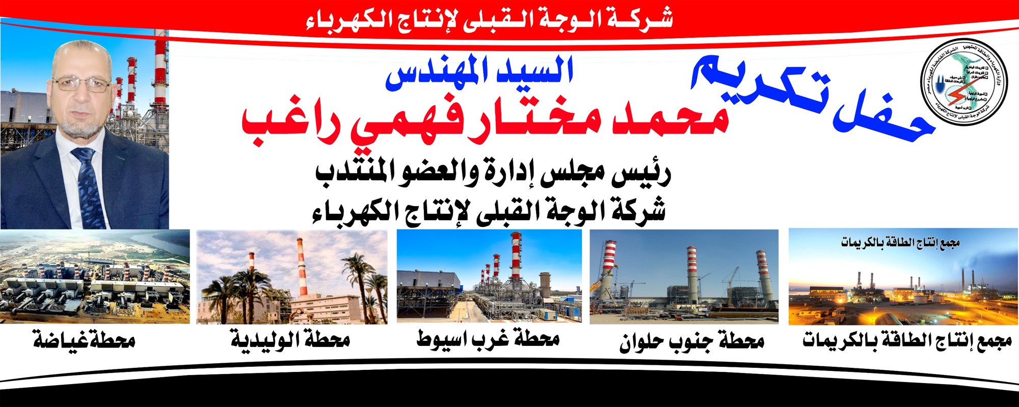 اقامت شركة الوجه القبلي لإنتاج الكهرباء حفل تكريم للسيد المهندس / محمد مختار فهمي راغب رئيس مجلس إدارة الشركة بمناسبة بلوغ سيادته 60 عاما منهم أربعون عاما من العطاء لقطاع الكهرباء في مصر من خلال العمل بين شركتي القاهرة لإنتاج الكهرباء وشركة الوجه القبلي لإنتاج الكهرباء وقد حضر الحفل قامات وقمم وزارة الكهرباء والطاقة المتجددة ورؤساء مجالس إدارة الشركة السابقين وكذلك أعضاء مجلس إدارة الشركة وقيادات الشركة وجانب من العاملين بالشركة ورئيس النقابة العامة للمرافق وكذلك رئيس شركة القاهرة لإنتاج الكهرباء ورئيس شركة القناة لتوزيع الكهرباء