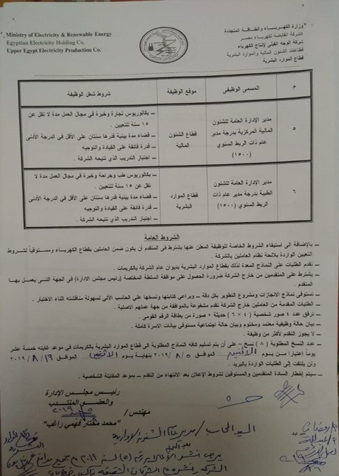 تعلن شركة الوجه القبلي لانتاج الكهرباء عن حاجتها للوظائف التالية:-